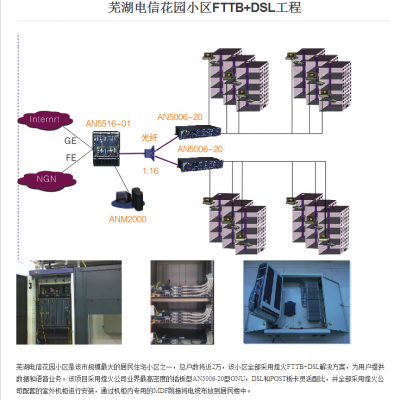 案例內(nèi)容:蕪湖電信花園小區(qū)是該市規(guī)模最大的居民住宅小區(qū)之一,總戶數(shù)將近2萬,該小區(qū)全部采用烽火FTTB+DSL解決方案,為用戶提供數(shù)據(jù)和語音業(yè)務(wù)。該項目采用烽火公司業(yè)界最高密度的插板型AN5006-20型ONU,DSL和POST板卡靈活配比,并全部采用烽火公司配套的室外機柜進行安裝,通過機柜內(nèi)專用的MDF跳接將電纜布放到居民樓中。