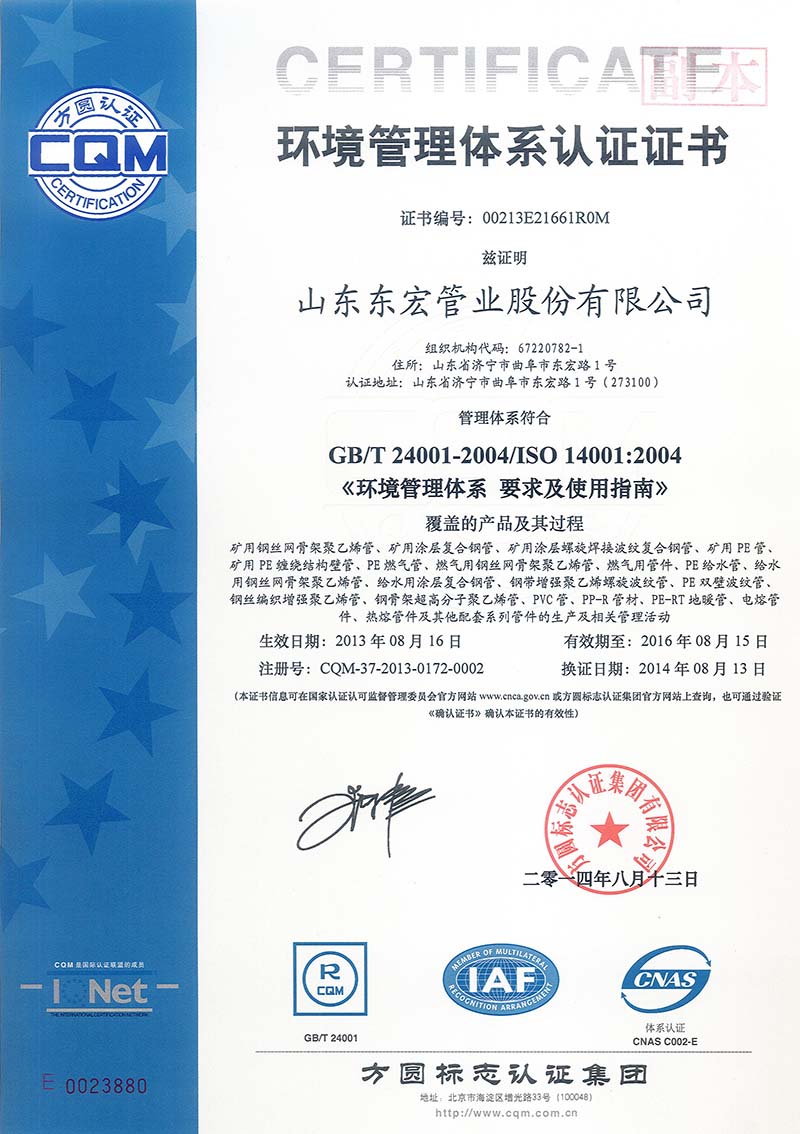 山東東宏管業(yè)股份有限公司單位性質是股份有限公司(非上市、自然人投資或控股),成立于2008年1月21日(原山東東宏管業(yè)有限公司,2013年12月9日更名),是山東東宏集團有限公司(原成立于1997年8月4日的曲阜市東宏實業(yè)有限公司)的控股子公司,秉承了集團公司的企業(yè)文化及生產(chǎn)理念,是目前國內專業(yè)生產(chǎn)礦用、瓦斯抽放用、燃氣用、油田用、電力工業(yè)用、基礎設施用、民用管材及各種配套管件系列產(chǎn)品的大型塑料管材生產(chǎn)基地。山東東宏管業(yè)股份有限公司主要產(chǎn)品有:鋼絲網(wǎng)骨架聚乙烯復合管、PE給排水管、給水用聚乙烯(環(huán)氧樹脂)涂層復合鋼管、PE礦用管、礦用聚乙烯(環(huán)氧樹脂)涂層復合鋼管、礦用聚乙烯(環(huán)氧樹脂)涂層螺旋焊接波紋復合鋼管、礦用PE纏繞結構壁管、礦用鋼絲編織增強聚乙烯復合管、PE燃氣管、RIP增強熱塑性塑料復合管、PE鋼帶增強螺旋波紋管、PP-R管、PP-R塑鋁穩(wěn)態(tài)管、PE-RT地暖管、PE超高耐磨管、鋼絲編織增強PE管、高壓橡膠管、雙點擊查看