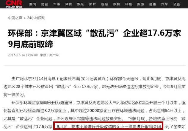 據(jù)央廣網(wǎng)、上海證券報(bào)消息,環(huán)保部7月14日通報(bào),截止6月底,京津冀及周邊地區(qū)28個(gè)城市已經(jīng)核查出“散亂污”企業(yè)17.6萬(wàn)家,對(duì)無(wú)法升級(jí)改造達(dá)標(biāo)排放的企業(yè),今年9月底前將一律關(guān)閉。