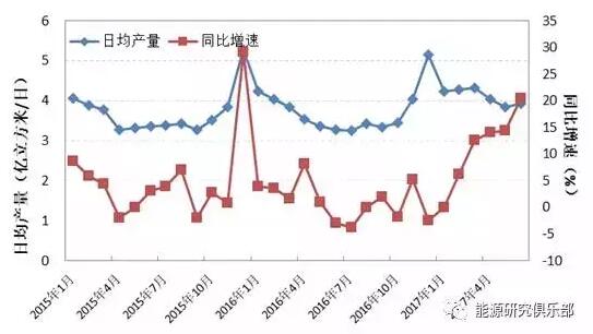 圖4 我國天然氣生產(chǎn)情況(2015年1月至2017年6月)