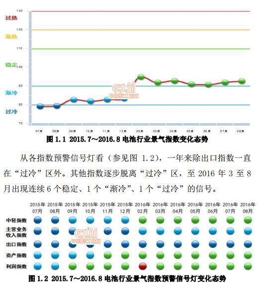 2015年3月至8月中輕電池景氣指數(shù)連續(xù)6個月在“過冷”區(qū)運行,9月至12月在“漸冷”區(qū)運行,2016年2月起在電池利潤、資產(chǎn)指數(shù)增長的影響下,中輕電池景氣指數(shù)上升至“穩(wěn)定”區(qū)。2016年8月中輕電池景氣指數(shù)為92.59 ,與7月91.94相比上漲0.65個百分點。
