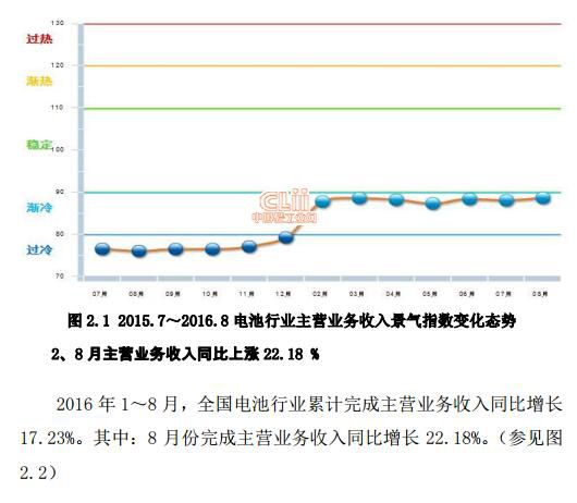 2014年10月至2015年12月,電池主營業(yè)務收入景氣指數(shù)一直在“過冷”提示區(qū)運行,2016年2月起連續(xù)7月在“漸冷”提示區(qū)。