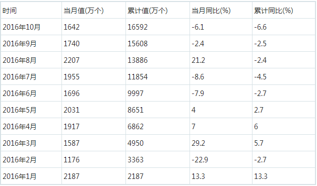前瞻產(chǎn)業(yè)研究院數(shù)據(jù)顯示,2016年10月全國鉛酸蓄電池出口量為1642萬個(gè),同比下降6.1%。1-10月累計(jì)出口量為16592萬個(gè),同比下降6.6%