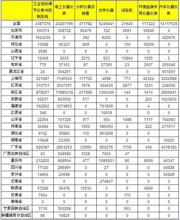 上海儀器儀表行業(yè)協(xié)會(huì)發(fā)布2012年1-3月儀器儀表主要子行業(yè)各地產(chǎn)量比較,第一季度,全國(guó)生產(chǎn)工業(yè)自動(dòng)化調(diào)節(jié)儀表與控制系統(tǒng)4387378臺(tái),電工儀器儀表24207196臺(tái),環(huán)境監(jiān)測(cè)專(zhuān)用儀器儀表117222套。