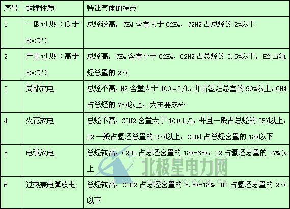 從大量統(tǒng)計(jì)數(shù)據(jù)中可以看出,變壓器內(nèi)部發(fā)生故障時產(chǎn)生的總烴中,各種氣體的比例在不斷變化,隨著故障點(diǎn)溫度的升高,CH4所占的比例逐漸減少,而C2H2和C2H6的比例逐漸增加,當(dāng)達(dá)到電弧溫度時C2H2成為主要成分??梢杂帽?-1所列特征氣體的特點(diǎn)來判斷故障的性質(zhì)。