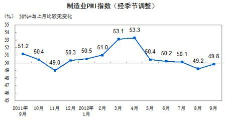 據(jù)國(guó)家統(tǒng)計(jì)局發(fā)布消息,2012年9月,中國(guó)制造業(yè)采購(gòu)經(jīng)理指數(shù)(PMI)為49.8%,比上月回升0.6個(gè)百分點(diǎn),接近臨界點(diǎn),為2012年5月以來(lái)連續(xù)4個(gè)月回落后的首次回升。