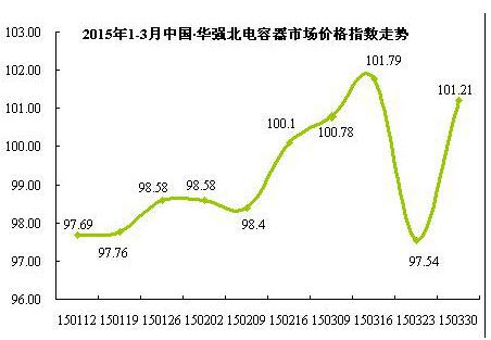 數(shù)據(jù)顯示,2015年3月中國˙華強(qiáng)北電容器市場月均價(jià)格指數(shù)為100.33點(diǎn),1-3月中國˙華強(qiáng)北電容器市場月均價(jià)格指數(shù)為99.24點(diǎn),高于1-2月的月均值。