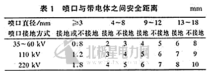 b. 帶電水沖洗人員保安措施保證帶電水沖洗人員的人身安全是開展帶電水沖洗作業(yè)的前提。 首先要遵循帶電作業(yè)的一般規(guī)定,穿絕緣靴,帶絕緣手套、安全帽等,有條件的還可以穿防水服裝;其次從使用的工具上要考慮其安全性,使用的水槍、水泵、盛水容器要可靠接地,帶電水沖洗的變電設(shè)備接地線要與地網(wǎng)相連,水槍外表要裝設(shè)絕緣護(hù)套(可使用絕緣熱縮電纜護(hù)套);再就是要考慮水柱的絕緣強度,因水沖洗時,主要靠水柱起絕緣作用,水沖洗噴嘴直徑不同,其噴口與帶電體間的安全距離也相應(yīng)改變,安全距離一般按表1執(zhí)行。