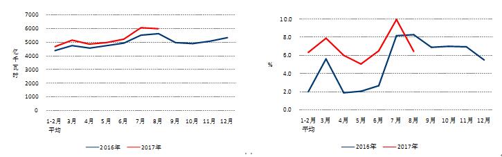 圖1 2016、2017年分月全社會(huì)用電量及其增速