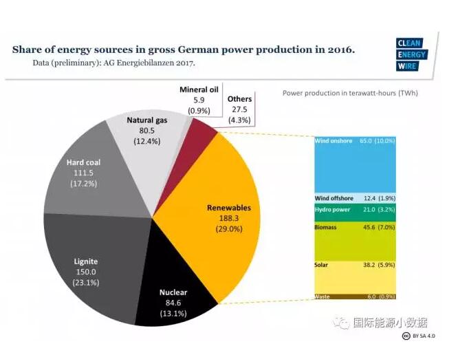 2016年,德國的發(fā)電量中有29.0%來自可再生能源(風(fēng)電11.9%、生物質(zhì)7.0%、太陽能5.9%、水電3.2%、垃圾0.9%),創(chuàng)歷史新高。但是,煤電依然占總發(fā)電量的40.3%,天然氣發(fā)電占13.1%、核電各占12.4%。在發(fā)電總量中,有53.4%的電源是化石能源。