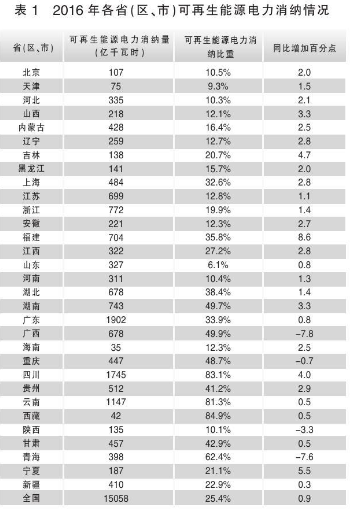2016年,包含水電在內(nèi),全部可再生能源電力消納量穩(wěn)步提高,達到15058億千瓦時,占全社會用電量的比重為25.4%,同比上升0.9個百分點。其中,西藏、四川、云南可再生能源電力消納占本地區(qū)全社會用電量分別為84.9%、83.1%、81.3%,位列前三甲。其他比重較大的?。ㄊ?、區(qū))包括青海(占比62.4%)、廣西(占比49.9)、湖南(占比49.7%)、重慶(占比48.7%)、甘肅(占比42.9%)、貴州(占比41.2%)、湖北(占比38.4%)。(詳見表1)