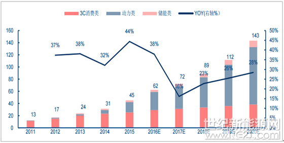 從電池分類型來看,2016年中國(guó)圓柱、軟包、方形鋰電池產(chǎn)量分別為13.92 GWh 、22.99 GWh 和26.64 GWh ,占比分別為 21.9%、36.2% 、41.9% 。其中方形電池增長(zhǎng)較快,主要是由國(guó)內(nèi)電動(dòng)汽車爆發(fā)式增長(zhǎng)拉動(dòng)所致。