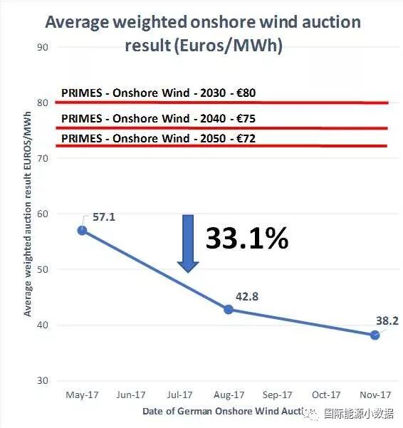 今年5月,德國(guó)第一輪陸上風(fēng)電807兆瓦項(xiàng)目招標(biāo)的中標(biāo)企業(yè)平均報(bào)價(jià)為57.1歐元/兆瓦時(shí);而在8月份第2輪的1吉瓦陸上風(fēng)電招標(biāo)中,中標(biāo)企業(yè)的平均報(bào)價(jià)為42.8歐元/千瓦時(shí)。也就是說,德國(guó)陸上風(fēng)電在過去6個(gè)月內(nèi)成本下降了33%。