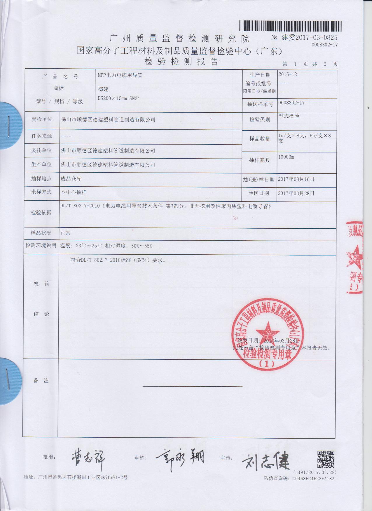 MPP電力電纜用導(dǎo)管DS200x15mm檢測報(bào)告