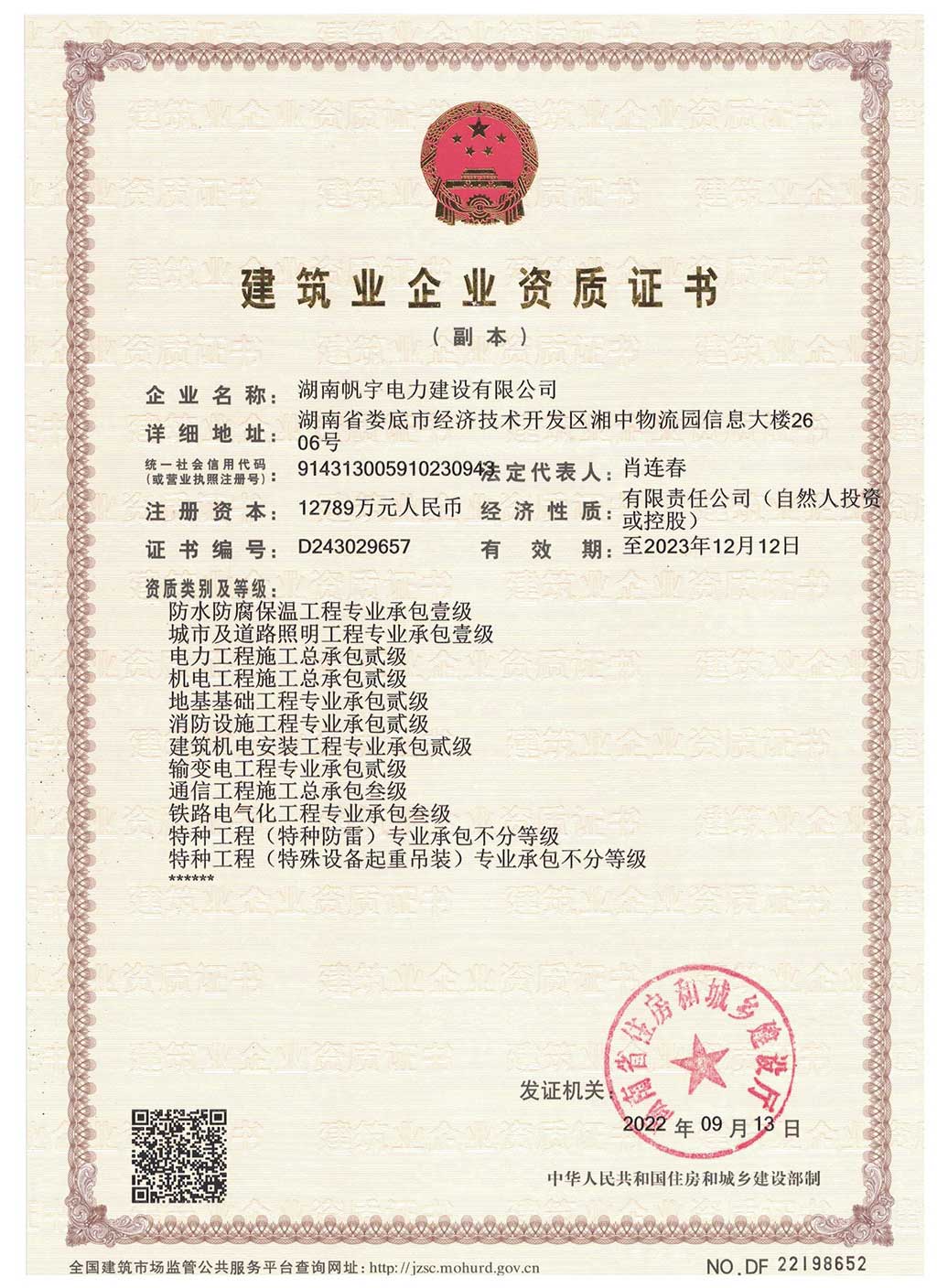湖南帆宇電力建設(shè)有限公司是根據(jù)現(xiàn)代企業(yè)管理模式和多年來從事輸變電施工的實(shí)際經(jīng)驗(yàn)成立的施工企業(yè)。公司系自主經(jīng)營、自我開拓的法人實(shí)體和市場競爭主體。 湖南帆宇電力建設(shè)有限公司成立于 2012 年 3 月 9 日,公司注冊資金12789 萬元。本公司是一家經(jīng)建設(shè)行政主管部門核定的防水防腐保溫工程專業(yè)承包壹級、城市及道路照明工程專業(yè)承包壹級、電力工程施工總承包貳級、機(jī)電工程施工總承包貳級、消防設(shè)施工程專業(yè)承包貳級、輸變電工程專業(yè)承包貳級、通信工程施工總承包叁級、特種工程(特種防雷)專業(yè)承包不分等級、建筑工程施工總承包叁級、水利水電工程施工總承包叁級、市政公用工程施工總承包叁級、地基基礎(chǔ)工程專業(yè)承包貳級、建筑機(jī)電安裝工程專業(yè)承包貳級、施工勞務(wù)不分等級、模板腳手架專業(yè)承包不分等級以及勞務(wù)派遣、電力行業(yè)(風(fēng)力發(fā)電、變電工程)專業(yè)乙級、工程勘察專業(yè)類(工程測量)乙級、電力行業(yè)(送電工程)專業(yè)甲級的施工點(diǎn)擊查看
