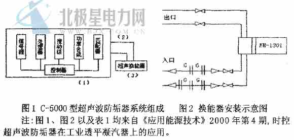 該廠凝汽器EH一1301應(yīng)用的C-5000型防垢器主要由超聲波功率發(fā)生器(1)、傳輸電纜(2)和裝于凝汽器循環(huán)冷卻水入口管道內(nèi)的壓電式換能器(3)組成如圖1所示。