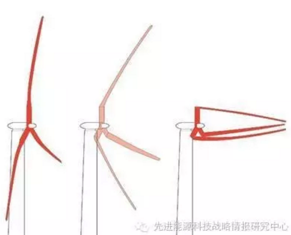 傳統(tǒng)的逆風(fēng)型轉(zhuǎn)子葉片需要足夠大的剛性以避免強風(fēng)中產(chǎn)生作業(yè)疲勞并消除停工風(fēng)險,這使得重量和體積都異乎尋常的大,造成造價昂貴且使得進一步提高功率變得十分困難。而桑迪亞實驗室的這種順風(fēng)型轉(zhuǎn)子設(shè)計受到棕櫚樹在風(fēng)暴中搖曳的啟發(fā),具有負(fù)荷調(diào)節(jié)功能,可極大降低葉片的峰值應(yīng)力和疲勞度。輕量化的分段軀干類似于一系列圓柱殼銜接組裝而成,可使整個葉片在風(fēng)中彎曲的同時保持每段葉片自身的剛性,從根本上降低了對葉片整體剛性的要求,并且由于分段制造,其生產(chǎn)和安裝成本都顯著降低。當(dāng)強風(fēng)暴來襲時,通過輪轂處的耳軸鉸鏈?zhǔn)掌鹁扌腿~片,與風(fēng)向一致,以降低懸臂受力避免受損;當(dāng)風(fēng)速較低時,葉片展開以產(chǎn)生最多的能量。
