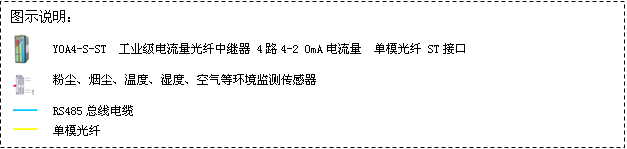 系統(tǒng)簡介:廠區(qū)內(nèi)粉塵傳感器、煙塵傳感器、濕度傳感器、氮氧化物傳感器以及溫度傳感器等傳感器采集廠房環(huán)境信息,轉(zhuǎn)換為4-20mA電流量信號,通過易控達(dá)YOA系列電流量光纖中繼器,將4-20mA電流量信息轉(zhuǎn)換為光纖遠(yuǎn)距離通訊,上傳到中控室,再由控制中心根據(jù)收到的具體環(huán)境數(shù)據(jù),進(jìn)行調(diào)整處理,以改善工作環(huán)境的質(zhì)量。