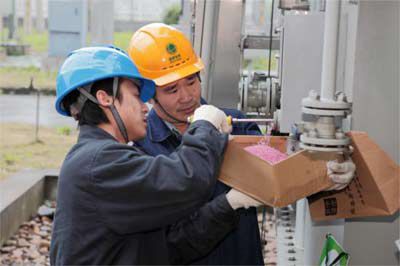 3月26日,富陽市供電局2名運行人員正在為110千伏長春變更換主變硅膠。這是該局第一次由運行人員獨立完成的設(shè)備消缺操作。