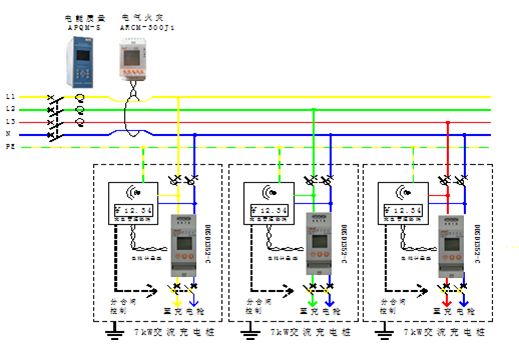 交流充電樁一般功率在7kW左右,總進(jìn)線(xiàn)回路配置電能質(zhì)量分析儀,對(duì)整個(gè)充電樁供電回路電能質(zhì)量進(jìn)行監(jiān)測(cè)。進(jìn)線(xiàn)回路同時(shí)設(shè)置電氣火災(zāi)監(jiān)控裝置。充電樁內(nèi)設(shè)置充電管理控制器,負(fù)責(zé)充電計(jì)費(fèi)控制;單相導(dǎo)軌式交流電能表,用于充電電能計(jì)量,電能數(shù)據(jù)由充電管理控制器通過(guò)RS485通訊口讀??;進(jìn)線(xiàn)側(cè)配置帶漏電保護(hù)斷路器;充電側(cè)配置帶電操微型斷路器等。