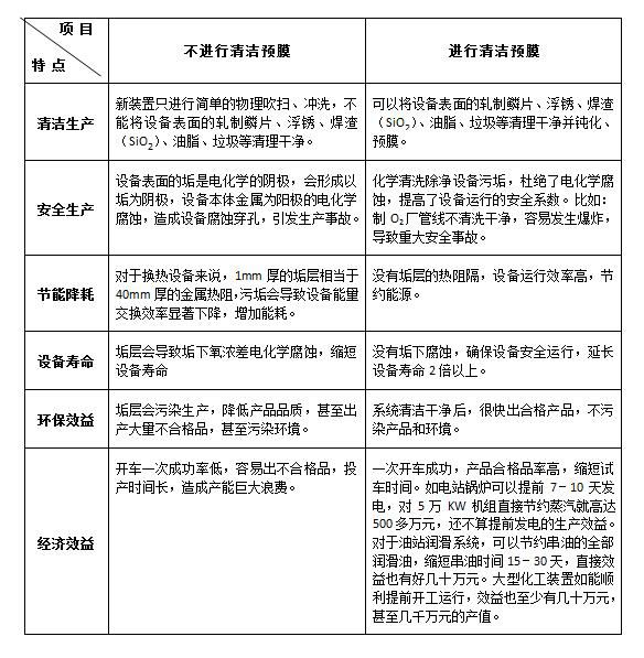 下面列表通過清潔生產(chǎn)、安全生產(chǎn)、節(jié)能降耗、設備使用壽命、環(huán)保效益、經(jīng)濟效益6方面對清洗預膜與不清洗預膜進行對比,這樣可以更清楚的看出新裝置開車前清洗預膜的必要性。