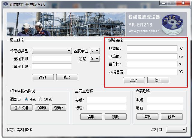云潤儀表制造有限公司生產(chǎn)的YR-ER213智能溫度變送器通過USB串口編程器連接PC機(jī),PC機(jī)上安裝溫度變送器編程組態(tài)軟件后就能對儀表參數(shù)進(jìn)行組態(tài)和監(jiān)測溫度變送器實時工作狀態(tài)。智能溫度變送器組態(tài)軟件功能介紹1、通過溫度變送器編程軟件進(jìn)行實時數(shù)據(jù)監(jiān)測在智能溫度變送器編程軟件組態(tài)界面可以在線顯示、監(jiān)控現(xiàn)場溫度傳感器溫度(單位℃)、實時輸出電流(mA)和輸出0%-100%刻度