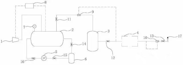為了實現(xiàn)上述目的,本發(fā)明采用如下技術(shù)方案:一種模擬氣體閥門內(nèi)漏的試驗裝置,包括主管線、儀表管線、壓力信號線和控制信號線,還包括空氣壓縮機(jī)、儲氣罐、緩沖罐、試驗閥門組、差壓計、參比罐、溫度計、空壓機(jī)控制系統(tǒng)、第一調(diào)壓閥、第二調(diào)壓閥、第一閥門、第二閥門、第三閥門、第一儀表閥門、第二儀表閥門、第三儀表閥門以及第六“8”字型盲板,所述空氣壓縮機(jī)、儲氣罐、第一閥門、第一調(diào)壓閥、緩沖罐、第二閥門、試驗閥門組、第二調(diào)壓閥、第三閥門和第六“8”字型盲板通過主管線依次連接,所述儲氣罐、第一儀表閥門、參比罐、第二儀表閥門、差壓計和第三儀表閥門通過儀表管線依次連接,所述溫度計設(shè)置在儲氣罐之上,所述空氣壓縮機(jī)和空壓機(jī)控制系統(tǒng)通過控制信號線連接。