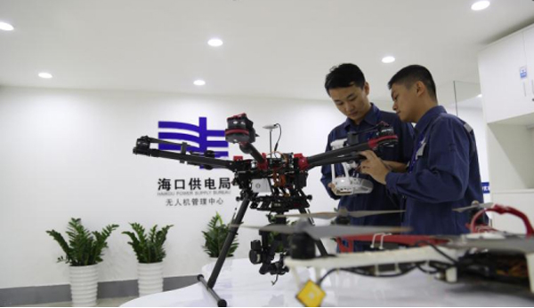 ??诠╇娋謫T工在學(xué)習(xí)無(wú)人機(jī)操控流程。 姚其欣 攝 ??诠╇娋謫T工在用無(wú)人機(jī)巡線(xiàn)