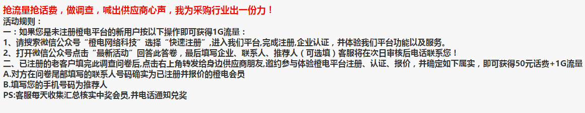 參與《橙電平臺供應商調(diào)查問卷》,搶1G流量+50元話費。
